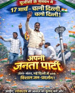 उत्तर प्रदेश /राष्ट्रीय दैनिक कर्म भूमि/नई दिल्ली आप सभी लोगों को अपनी जनता पार्टी का साथ देने के लिए 17 मार्च 2026 को जंतर मंतर नई दिल्ली पहुंचकर यूजीसी के
